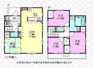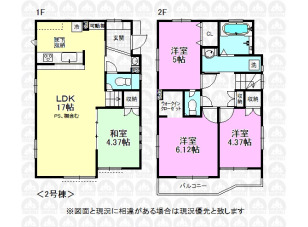 南側は道路とカースペースで陽当たり良好/並列駐車2台/17帖のLDKと4.37帖の和室が隣接/玄関に手洗場を設計