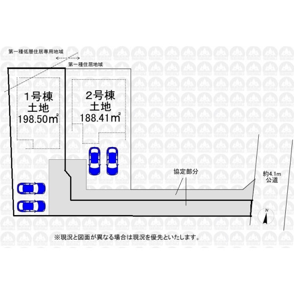| 備 考 | フラット35をご利用の場合には別途適合証明書取得費用が掛かります/上記土地面積のうち、協定部分・協定通路合計約70.23m2を含みます/協定部分・協定通路は地役権設定が行われます(買主負担)/本地北西側一部が第一種低層住居専用地域を含みます(建ぺい率60%容積率100%) |