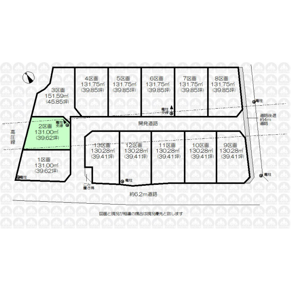 | 備 考 | 引渡までに地目を宅地に変更をします。/ゴミ置場持分約0.36m2あり。/水道負担金は買主負担となります。/高圧電線路下(約109.25m2)に該当するため、建物の建築の際に高さ制限がございます。/開発許可番号/指令第2025-0150号 |