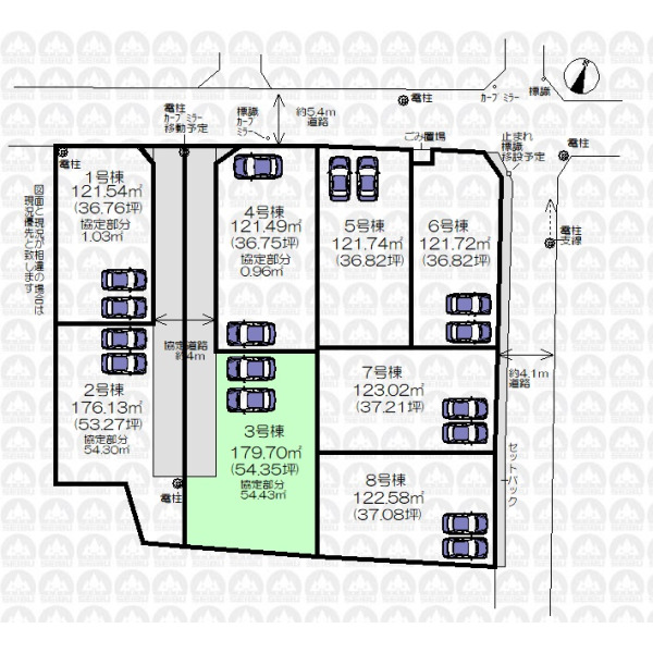 | 備 考 | ゴミ置場持分0.25m2あり/敷地面積に1号棟、2号棟、4号棟との協定道路54.43m2を含みます。地役権設定あり。/フラット35を利用する場合は適合証明取得費用が生じます。/未利用地持分0.28m2あり。/建物面積に車庫面積13.66m2を含みます。 |