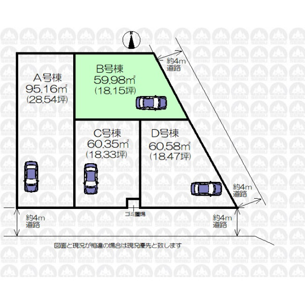 | 備 考 | フラット35を利用する場合は適合証明取得費用が生じます。/ゴミ置場持分0.26m2あり/建物面積に車庫面積11.02m2を含みます。 |