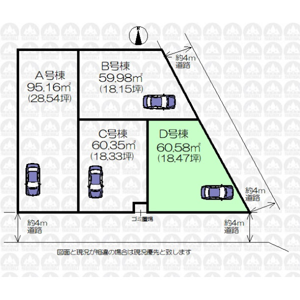 | 備 考 | フラット35を利用する場合は適合証明取得費用が生じます。/建物面積に車庫面積11.02m2を含みます。/ゴミ置場持分0.26m2あり/不整形地 |