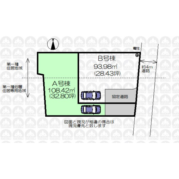| 備 考 | 敷地の一部が第一種住居地域に面します。建ぺい率60%容積率200%/敷地にB号棟との協定道路約15.3m2を含みます。/フラット35を利用する場合は適合証明取得費用が生じます。 |