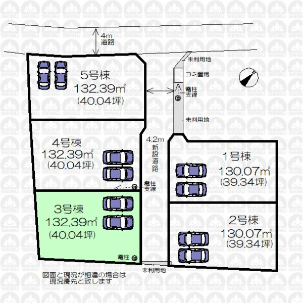 | 備 考 | フラット35ご利用の際は別途適合証明書取得費用が掛かります。/未利用地持分2.17m2、ゴミ置場持分0.5m2あります。 |