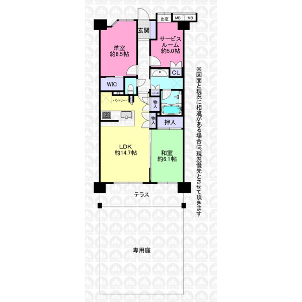 - 広い専用庭(43.21m2)付き/ペット飼育可(飼育細則有・1階は大型犬可)/陽当り住環境良好