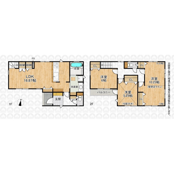 | 備 考 | 公簿面積87.66m2と実測面積87.14m2に相違がありますが、地積更正登記は行いません。/建物面積98.34m2に玄関ポーチ部分1.05m2含む。/洋室を将来2部屋として利用の場合、間仕切壁工事は有償となります。/景観法 |