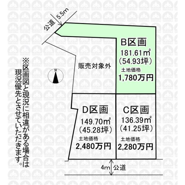 - 建築条件無し/5.5m公道面/都市ガス/本下水/更地