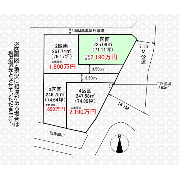 - 全4区画建築条件なし売地/敷地面積235.09m2(71.11坪)/お好きなハウスメーカーで建築できます。