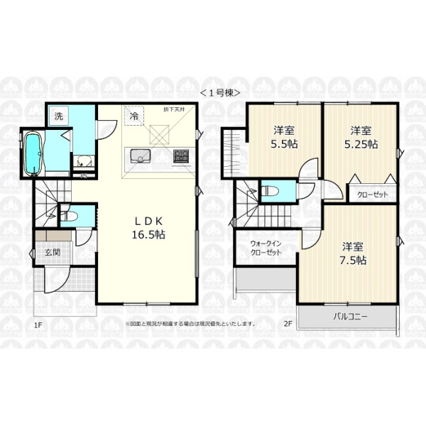 - リビングイン階段のLDKは16.5帖/WICを備えた主寝室7.5帖/カースペース並列2台可