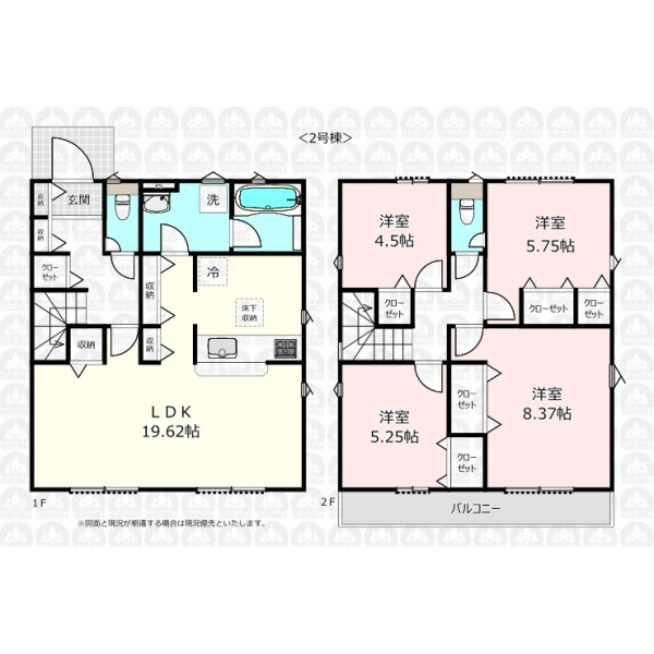 - 対面キッチンのLDKは広々19.62帖/主寝室8.37帖/全居室収納付き+玄関収納で収納豊富/カースペース2台可