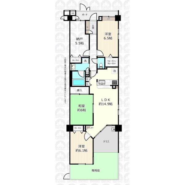 | 備 考 | テラス面積7.4m2/専用庭面積9m2/ペット飼育可(細則あり) |
