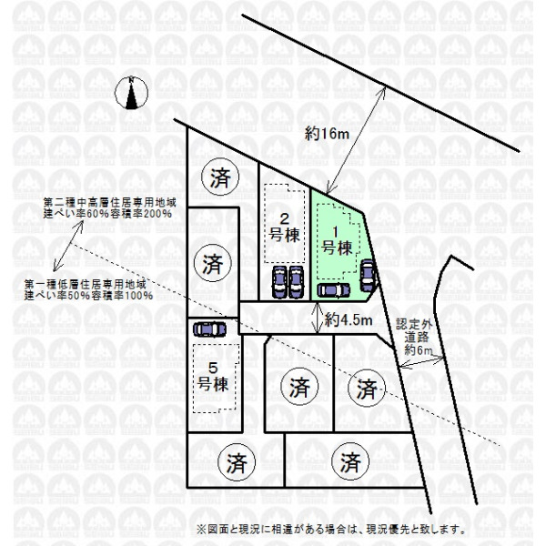 | 接道状況 | 三方 北東側16.00m公道(7.60m接道) 東側6.00m公道(9.10m接道) 南側4.50m私道(9.90m接道) |