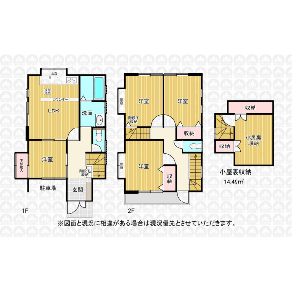 | 備 考 | 1階車庫部分の一部を居室に改築しています/本物件は容積率オーバーの為、住宅ローンは原則利用できません。また同規模の建物は再建築できません/建物未登記部分(小屋裏収納)約14.4m2有り/契約不適合責任免責/私道持分有(163m2の内30 分の1)/カースペース車種制限有/エアコン、照明器具、小物類は販売価格に含まれています |
