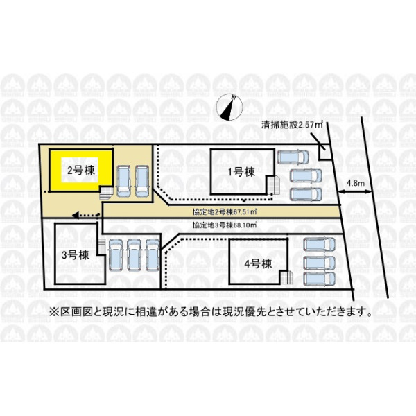 | 備 考 | 土地面積208.64m2に協定部分67.51m2含む(要地役権設定)/ゴミ置場持分約0.64m2有り |