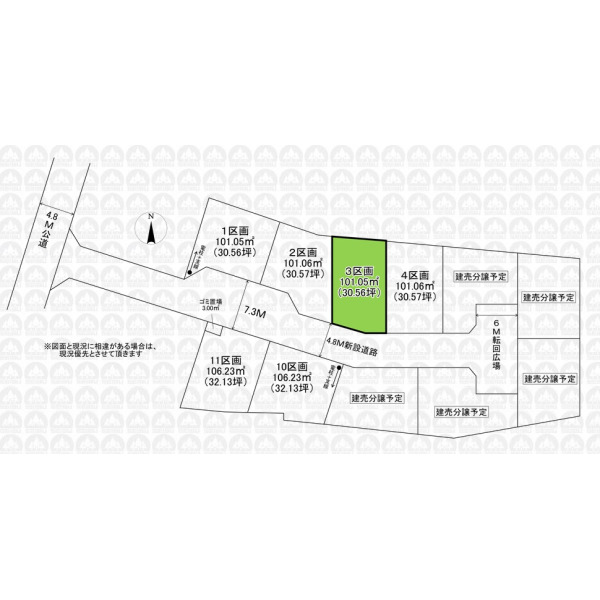 | 備 考 | 参考プラン(建物1,600万円/土地建物合計価格4,199万円)/地区計画:片山・西堀地区地区計画/外壁後退:建築物の外壁又はこれに代わる柱の面から有効距離50cm/文化財保護法(埋蔵文化財)/農地法/重要土地等調査法(特別注視区域)/景観法/ゴミ置場持分0.27m2/引渡時迄に地目を宅地へ変更します |
