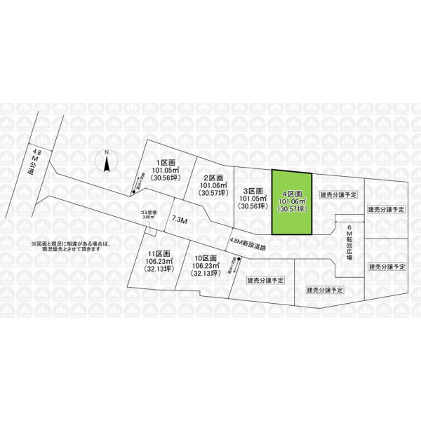 | 備 考 | 参考プラン(建物1,600万円/土地建物合計価格4,199万円)/地区計画:片山・西堀地区地区計画/外壁後退:建築物の外壁又はこれに代わる柱の面から有効距離50cm/文化財保護法(埋蔵文化財)/農地法/重要土地等調査法(特別注視区域)/景観法/ゴミ置場持分0.27m2/引渡時迄に地目を宅地へ変更します |
