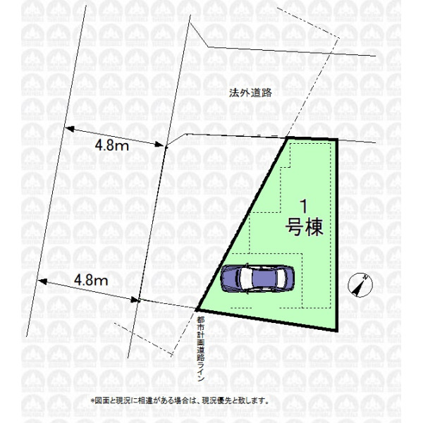 | 備 考 | 延床面積76.11m2のうち1階車庫7.79m2含む/都市計画道路3.4.1号保谷朝霞線事業決定有り/幅員20mは都市計画事業完了後の幅員です。 |