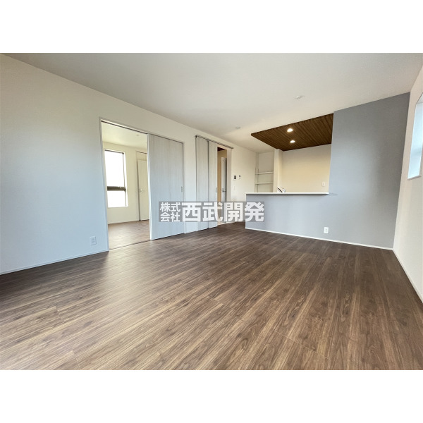 - LDK15帖の対面キッチン/カースペース並列2台(車種による)/前面道路5m/太陽光発電システム/2階に納戸あり